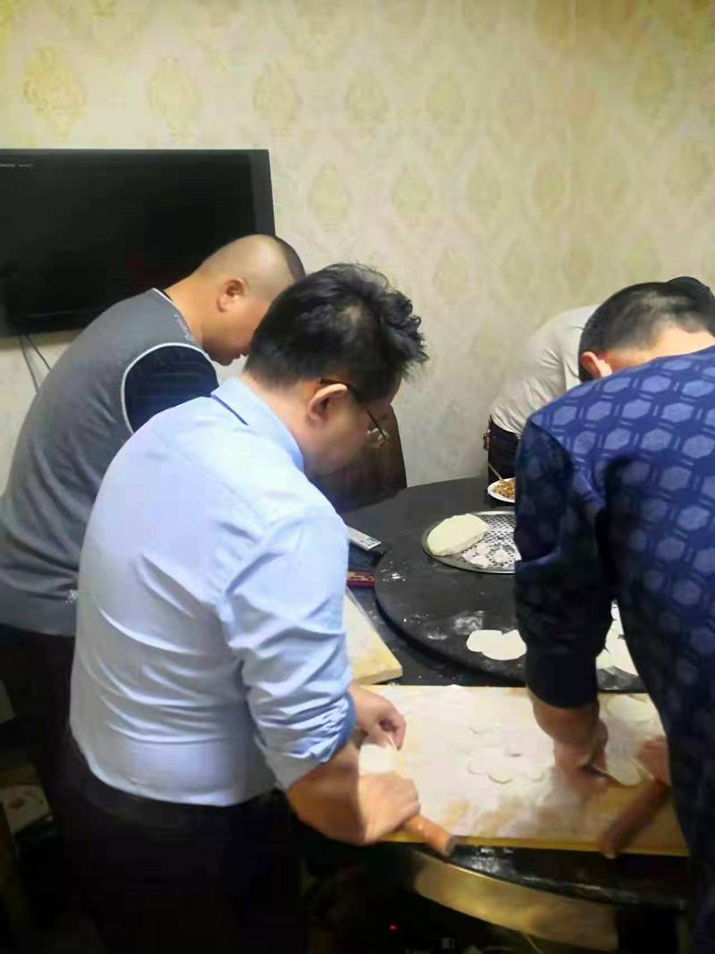 下午1点多钟,总经理王伟同志带领队员们开始热火朝天地忙起来。办公室里不时传出一阵阵欢声笑语,现场热闹非凡。大家一来便纷纷“抢占”自己的一席之地。看,有的在揉面,有的在擀皮、有的在调馅,个个动作娴熟,有说有笑唠家常,甚是热闹。