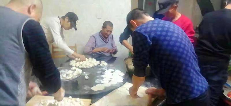 饺子馅现场边说边拌,不一会儿功夫,一大盆馅儿就完工了,有猪肉馅、白菜馅,“厨师长”王哥还为大家精心准备了凉拌黄瓜、凉拌土豆丝、凉拌木耳等小吃。每位保安员满怀热情、干劲十足,充分展示着自己的手艺。整个下午,大家分工合作,互帮互教,体验着协作的乐趣,感受着节日的温情,好一幅冬日温馨的“全家福”。
